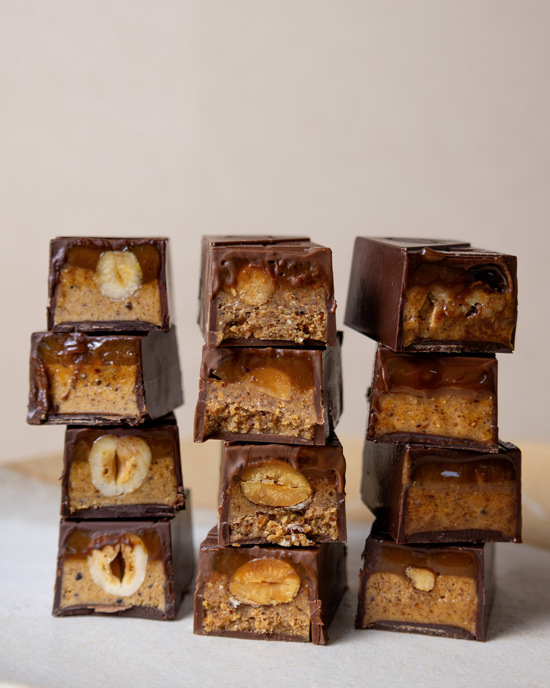 Noix de pécan, sucre, pâte de cacao, crème de lait pasteurisée, sirop de glucose beurre de cacao, beurre, café, eau, sel, émulsifiant : lécithine de soja, gousse de vanille de Madagascar.