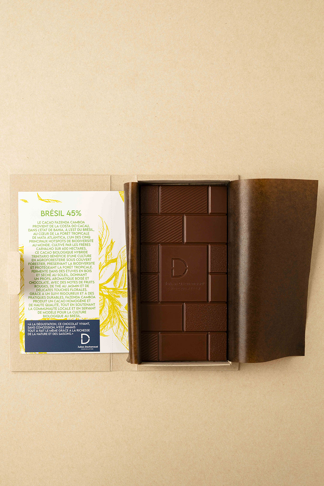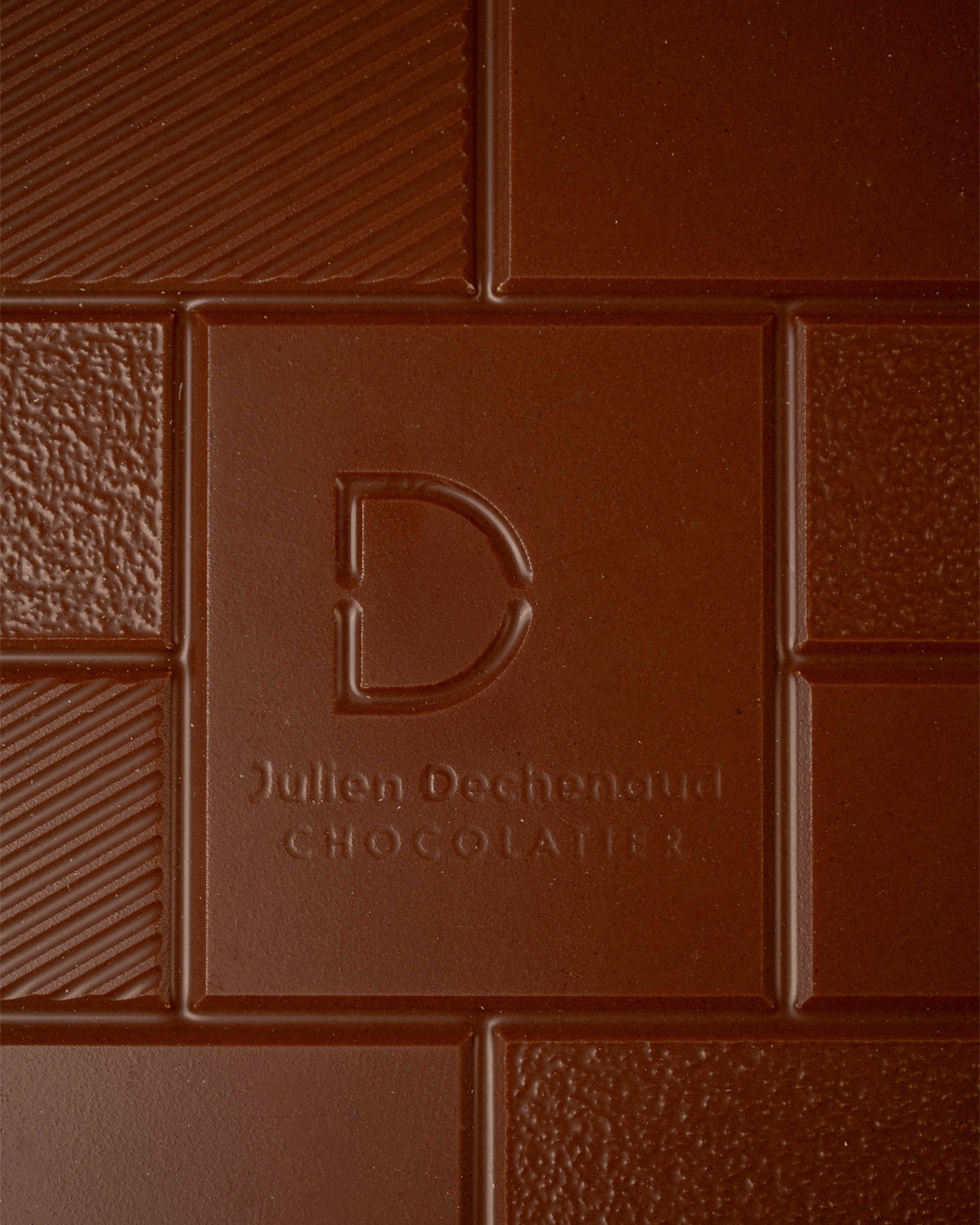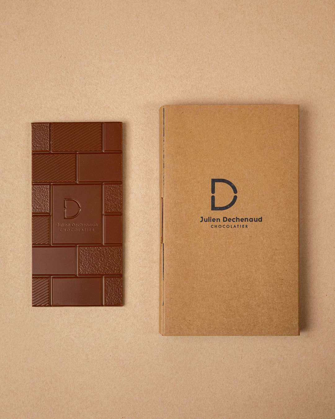 Tablette de chocolat au lait 45% élaborée à partir de fèves du Brésil aux notes notes de noisette grillée, caramel et fruits secs