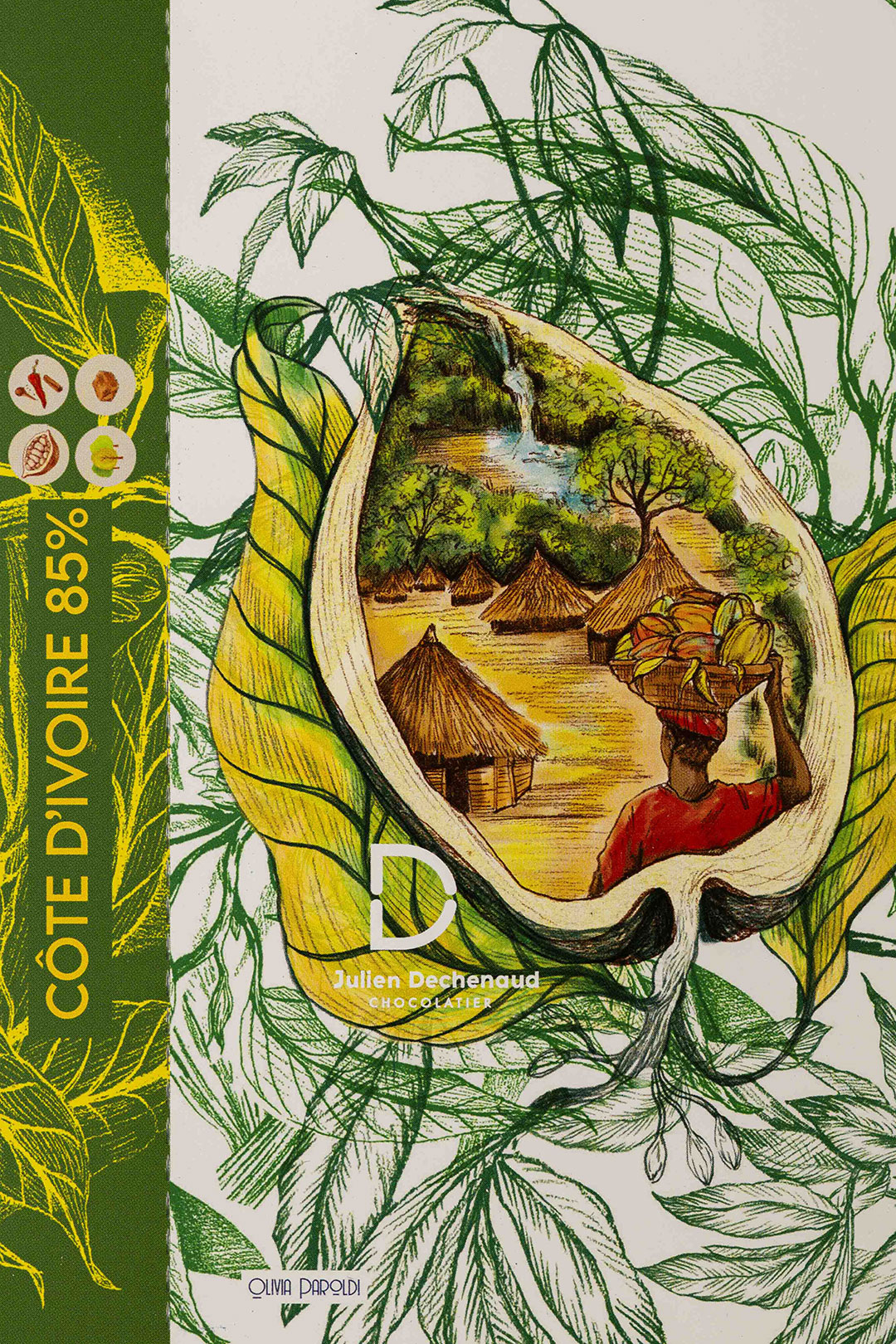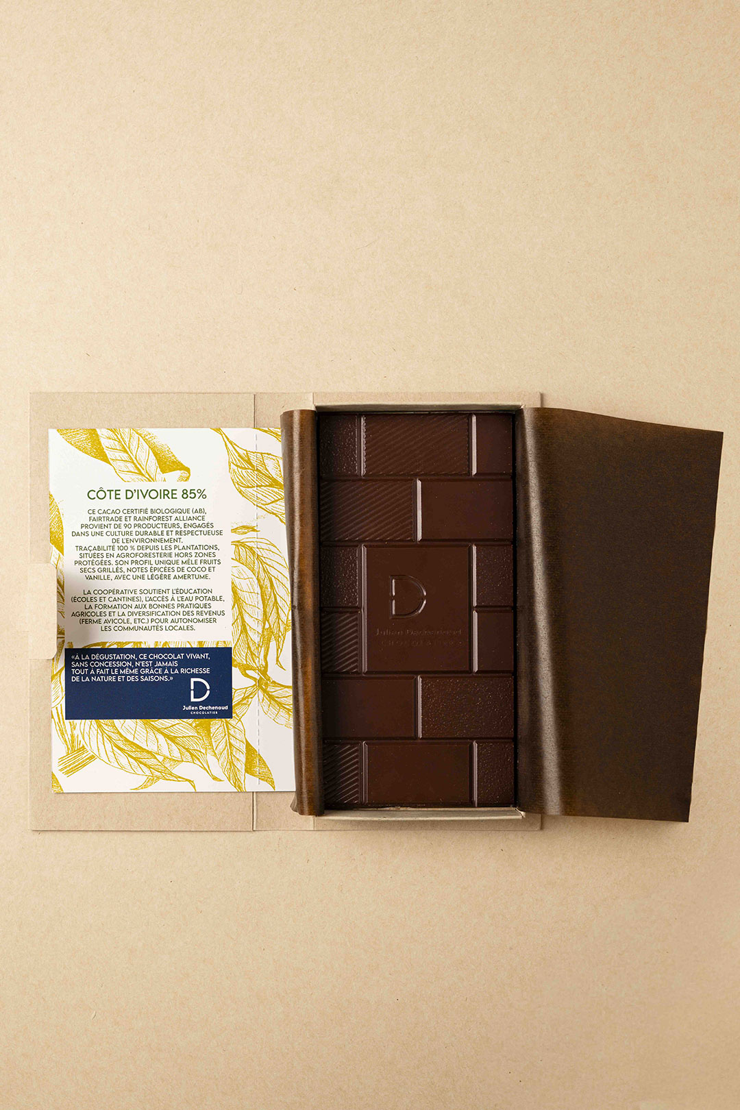 Tablette chocolat noir 85% Côte d’Ivoire aux notes très cacaotés, épicées, boisées, légèrement caramélisées.