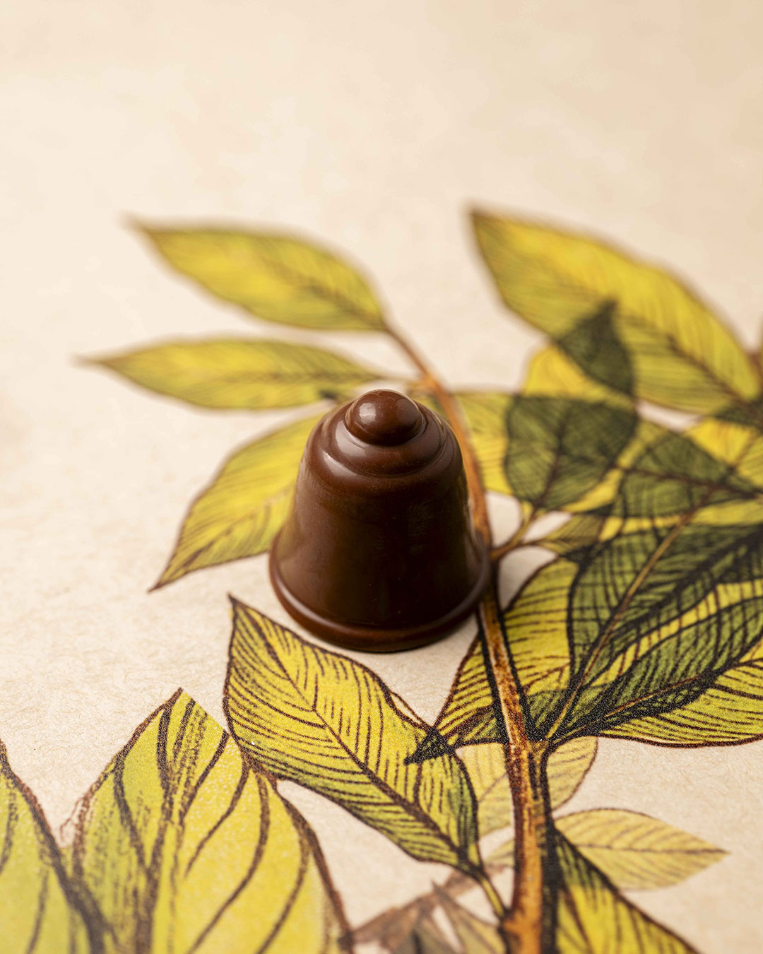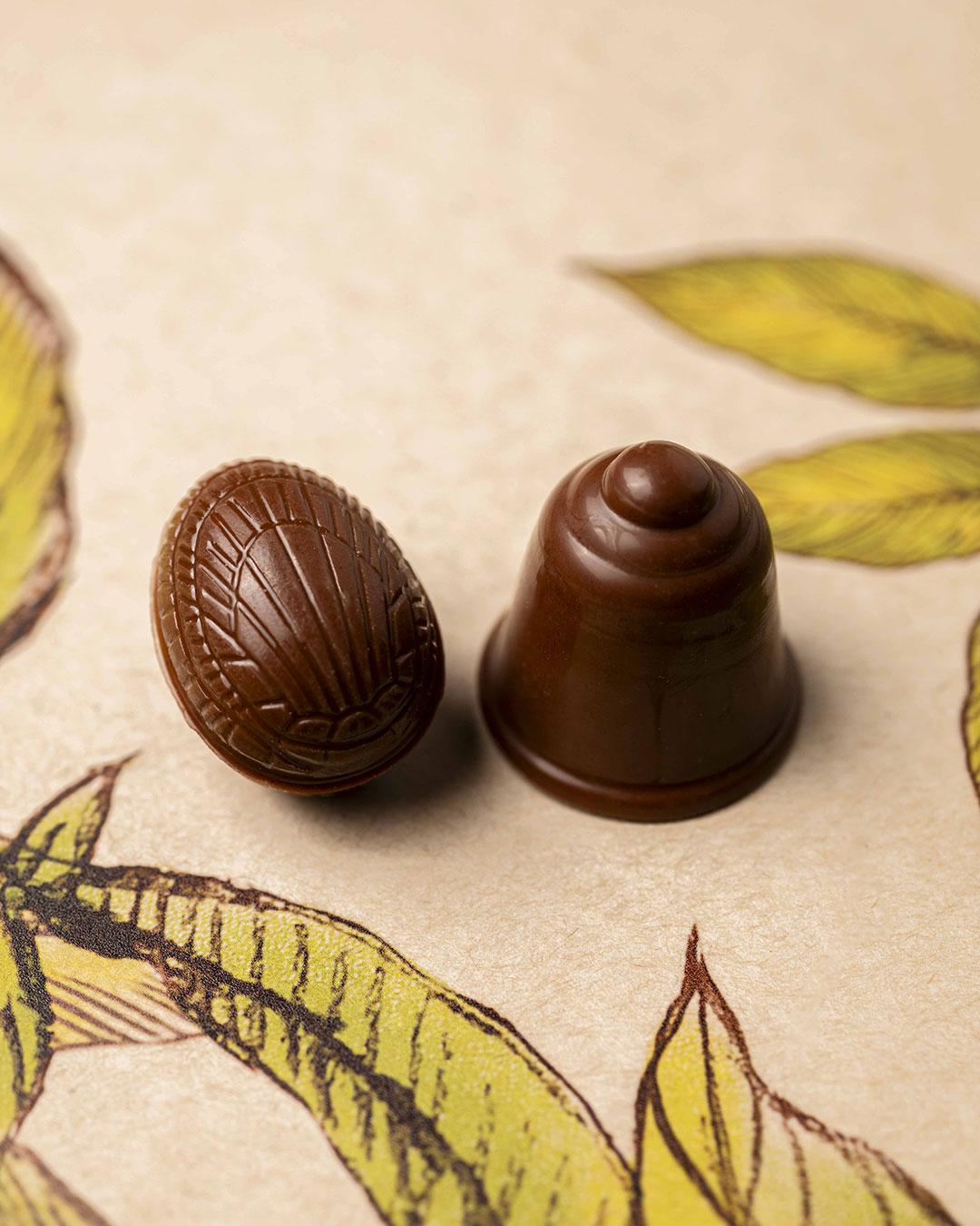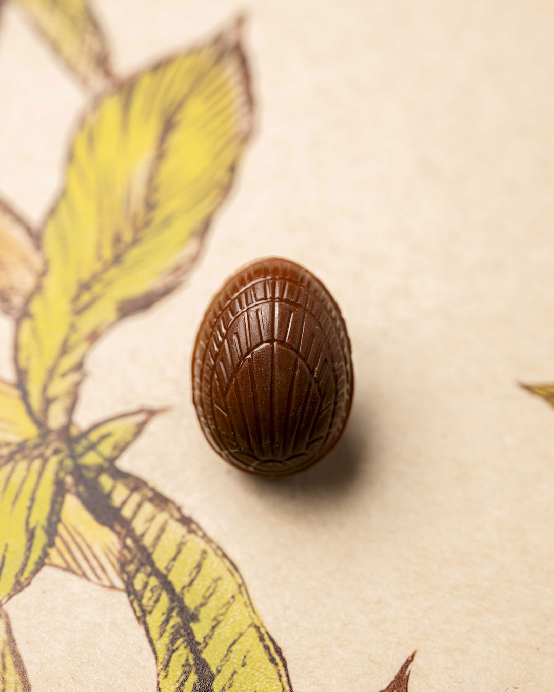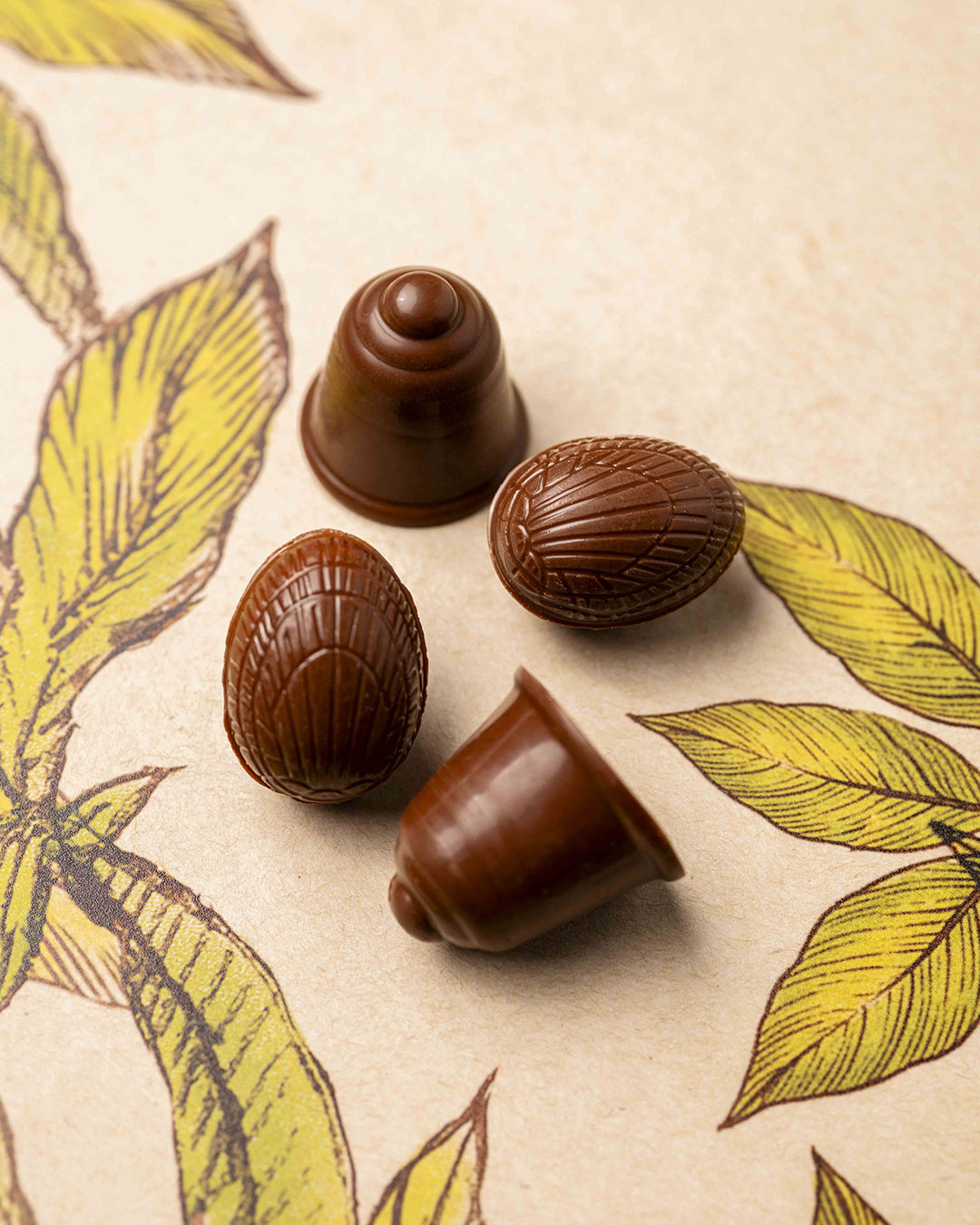 Délicieux sachet de fritures enrobées de chocolat au lait 48% végan et garnies de praliné amande pour les fruits de mer, de praliné noisette pour les œufs et de praliné amande noisette feuilleté pour les cloches*.