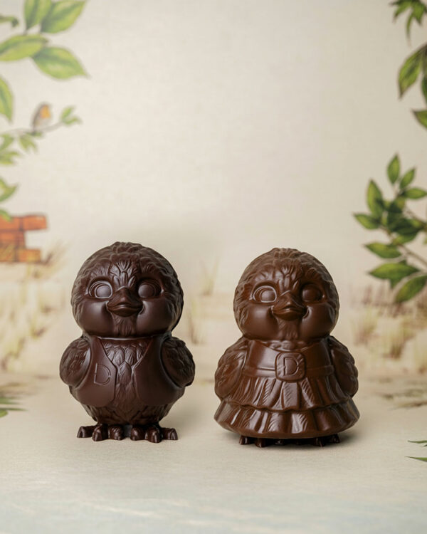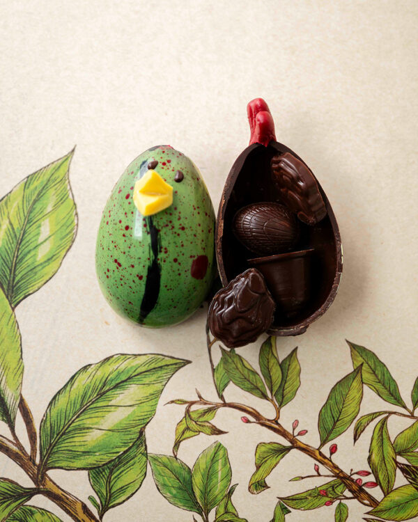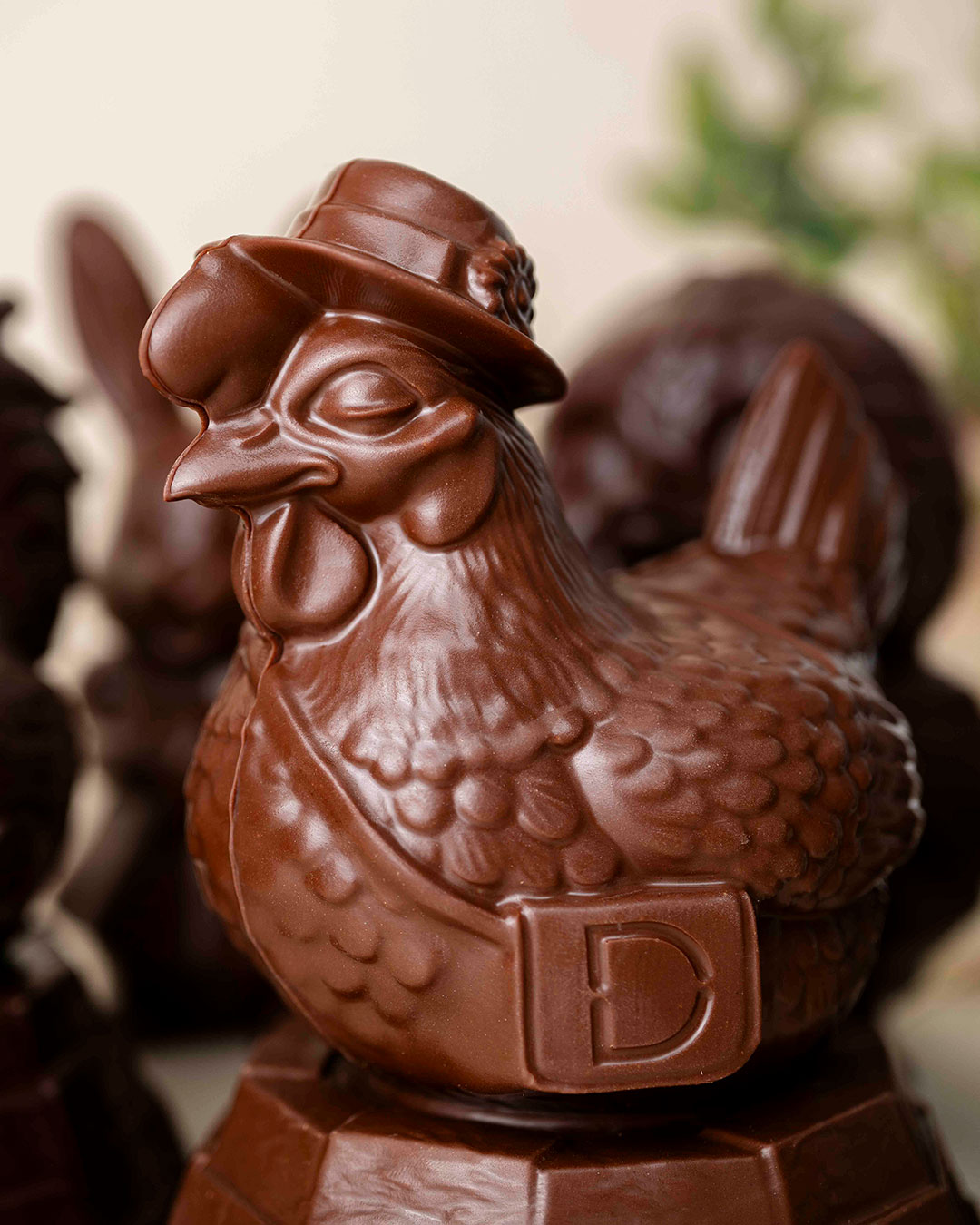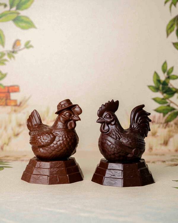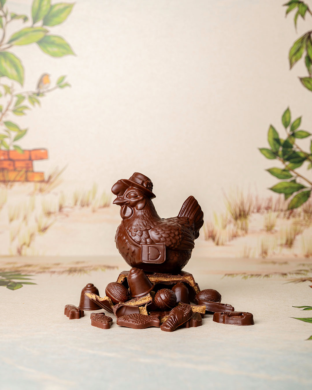 Poule en chocolat lait 48% végan garni de sa friture sèche et praliné