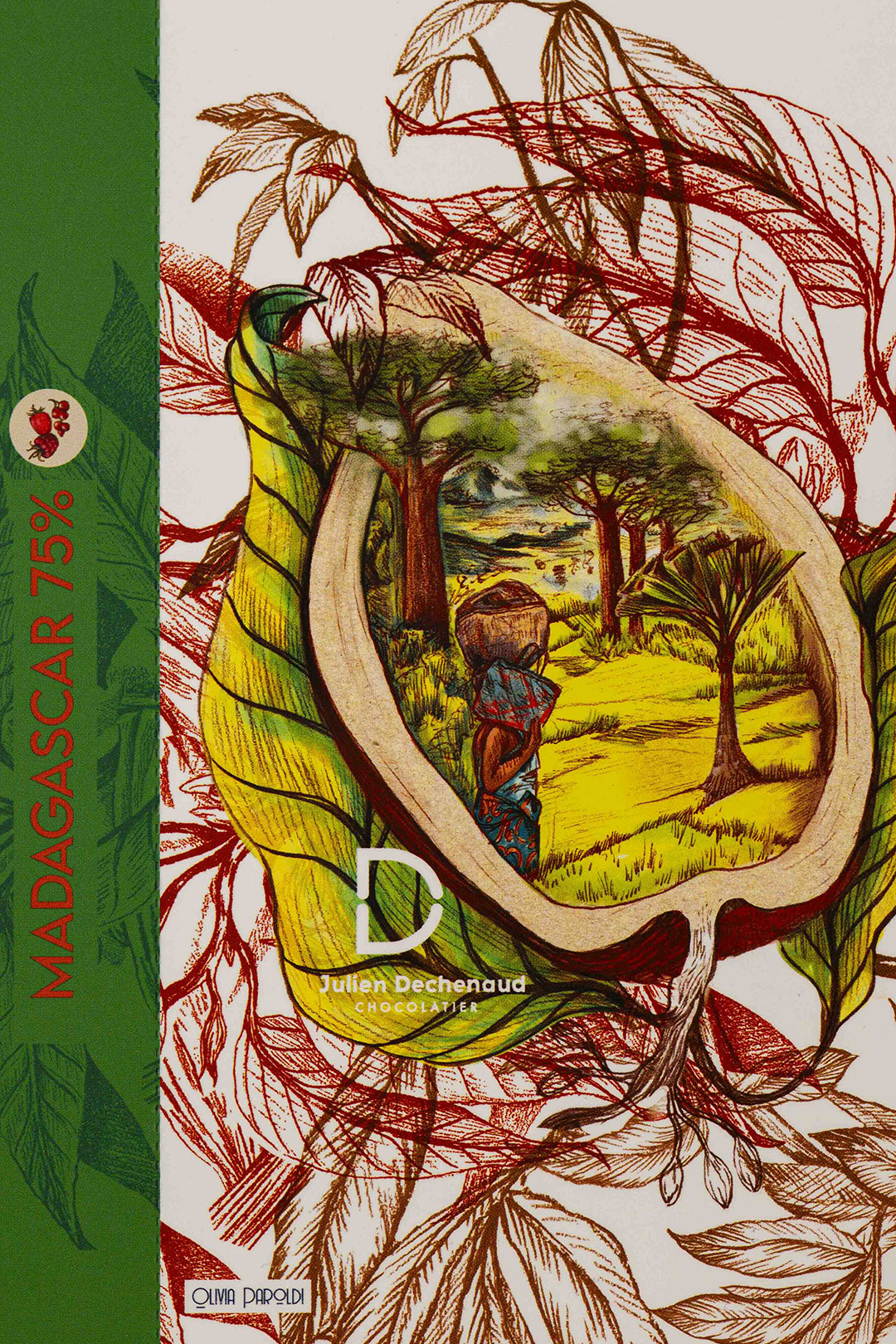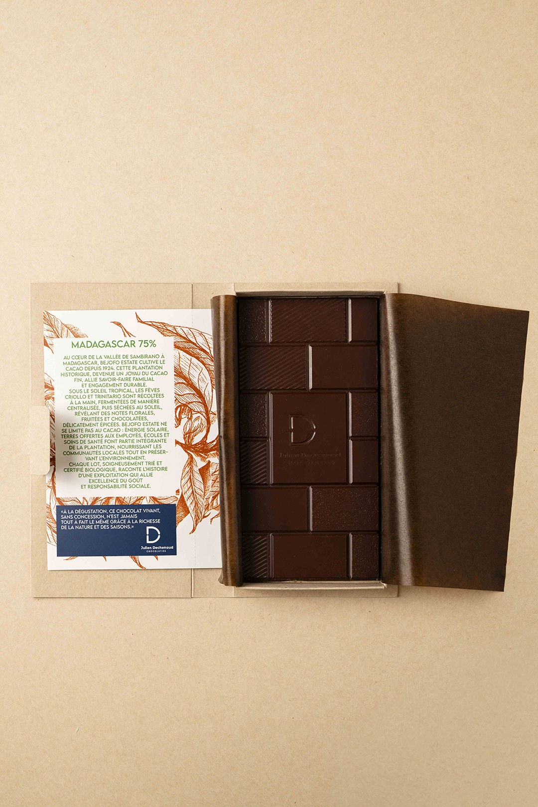Tablette de chocolat noir 75 % de Madagascar avec des notes d’acidité de fruits rouges.