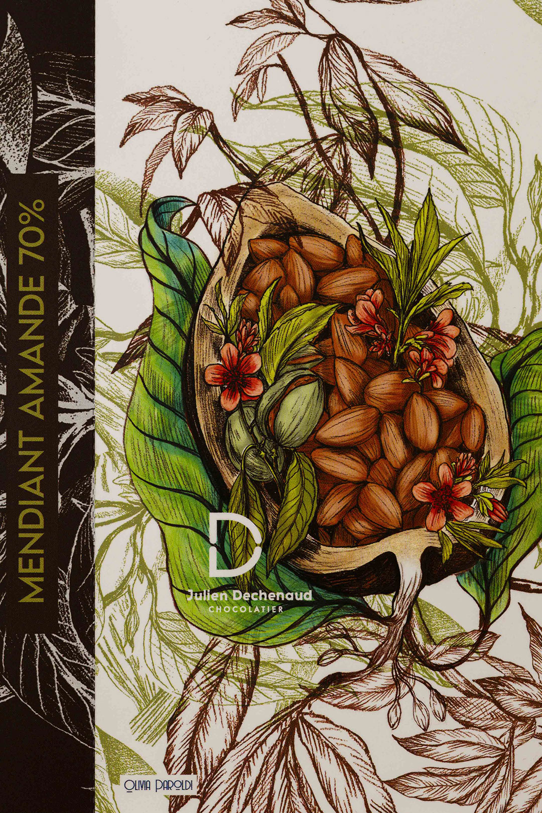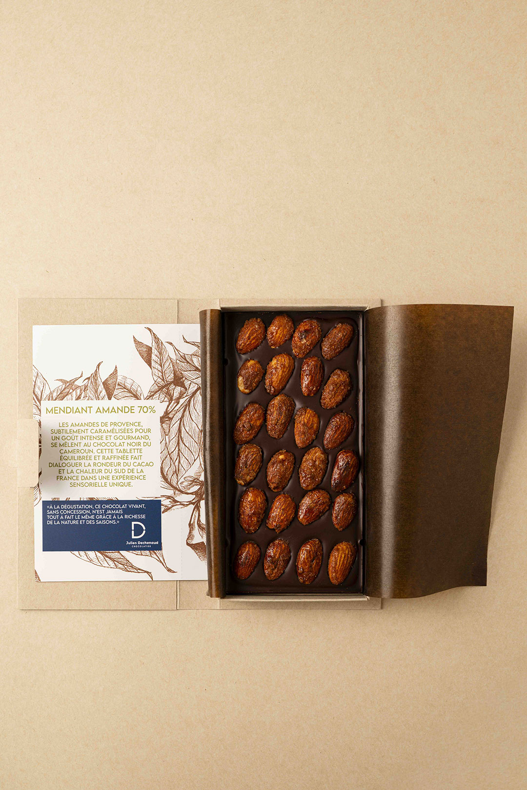 Alliance d’un chocolat noir 70 % et d’amandes de Provence torréfiées et caramélisées, pour une expérience intensément croquante.