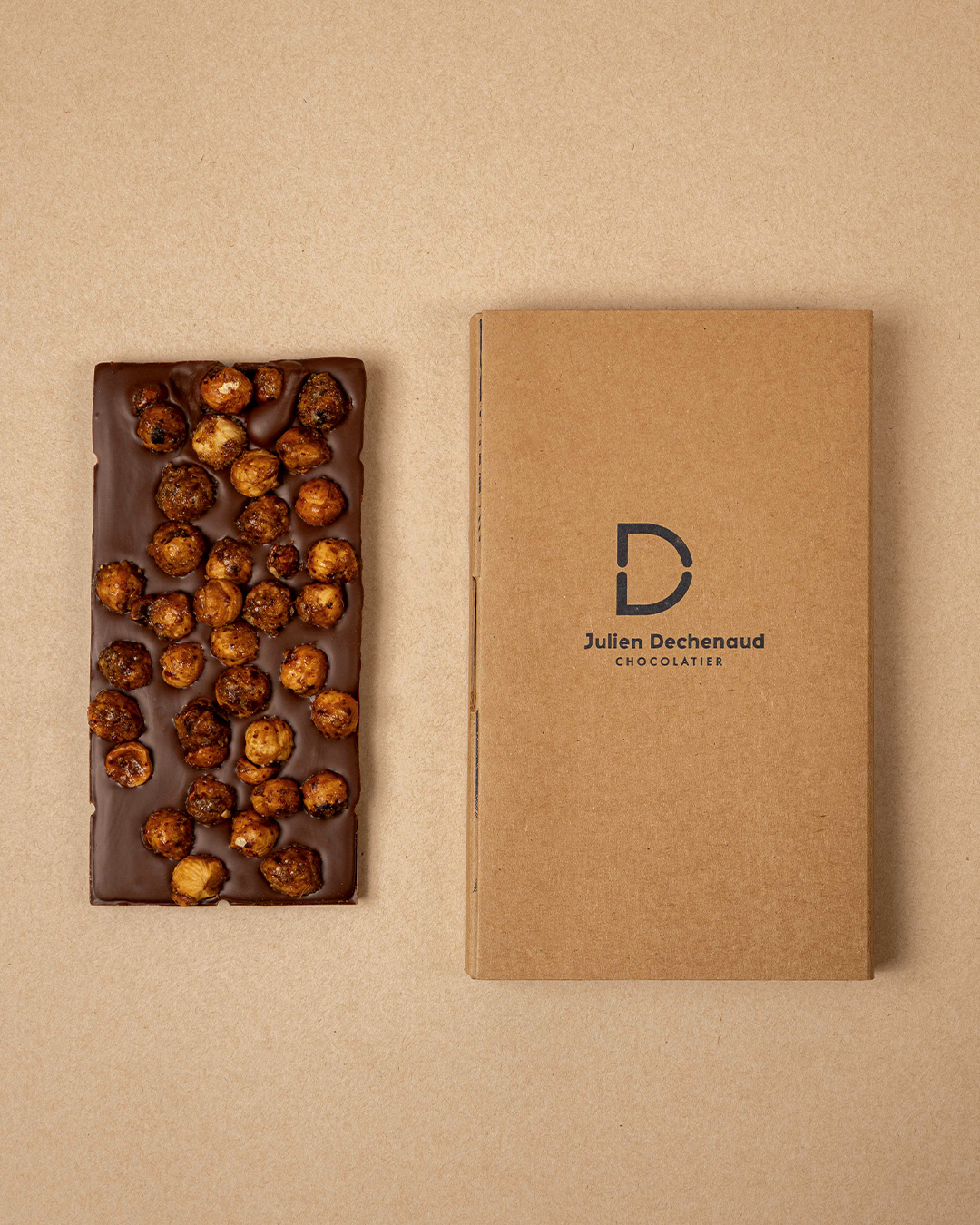 Chocolat au lait végan 48% Madagascar et noisettes du Lot-et-Garonne.