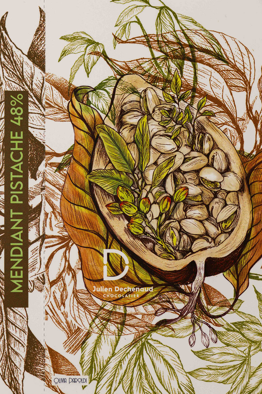 Chocolat au lait végan 48% Madagascar et pistaches de Sicile.
