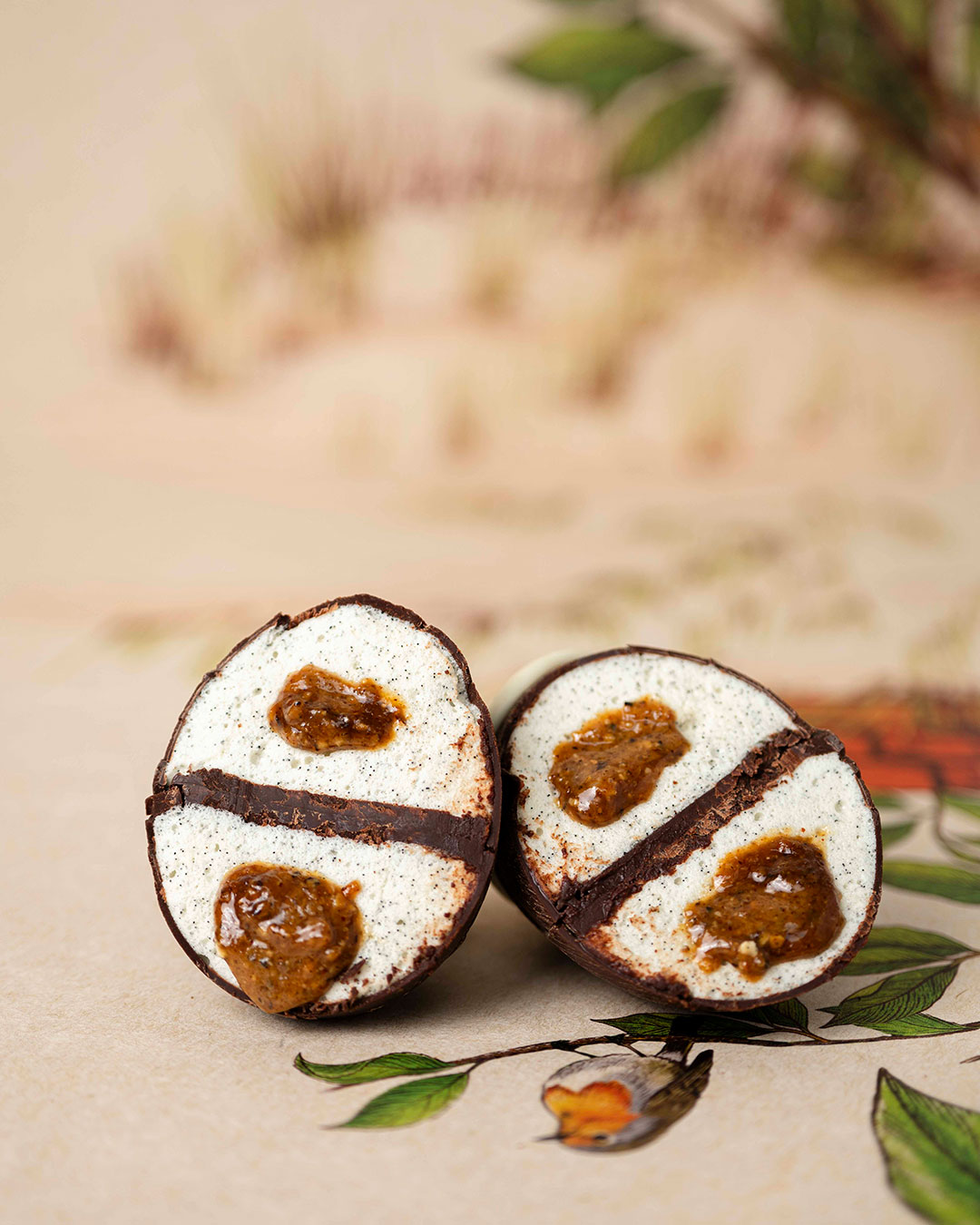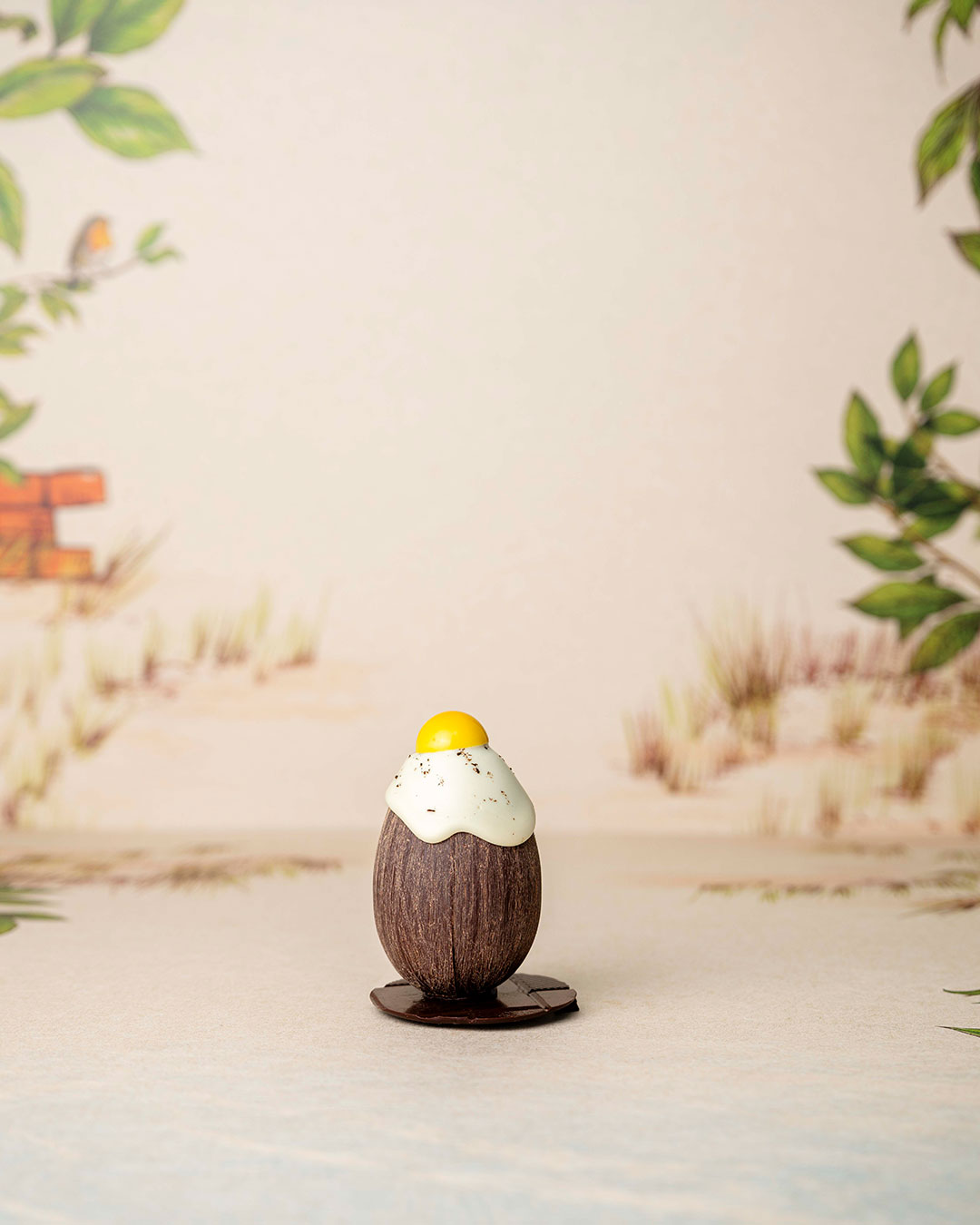 Coque chocolat du Cameroun 75% ,jaune d’œuf chocolat blanc végan garni d’une guimauve à la vanille et d’un praliné noisette coulant