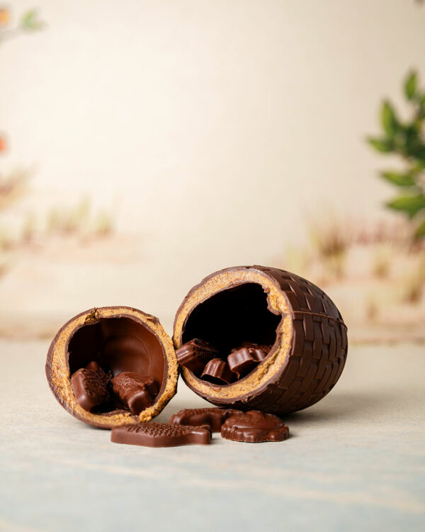 Une délicieuse coque en chocolat garni de guimauve à la vanille et un praliné coulant à la noisette gourmand en même temps léger. Ce délicat trompe l’œil vient tiller votre curiosité gustative.
