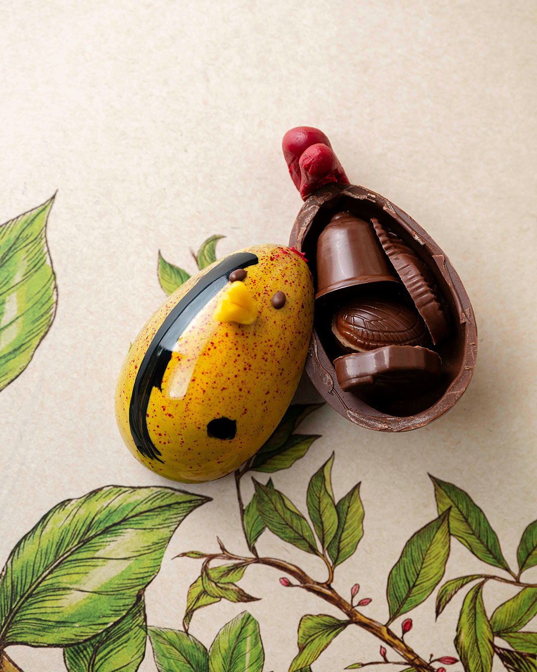 Œuf poule en chocolat au lait 48% végan garni de fritures sèches et pralinées végan*.