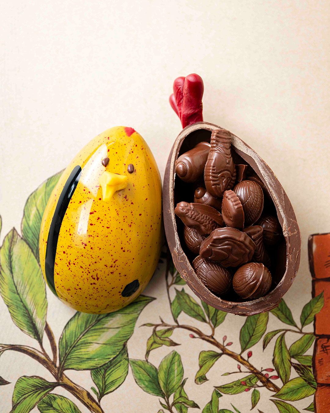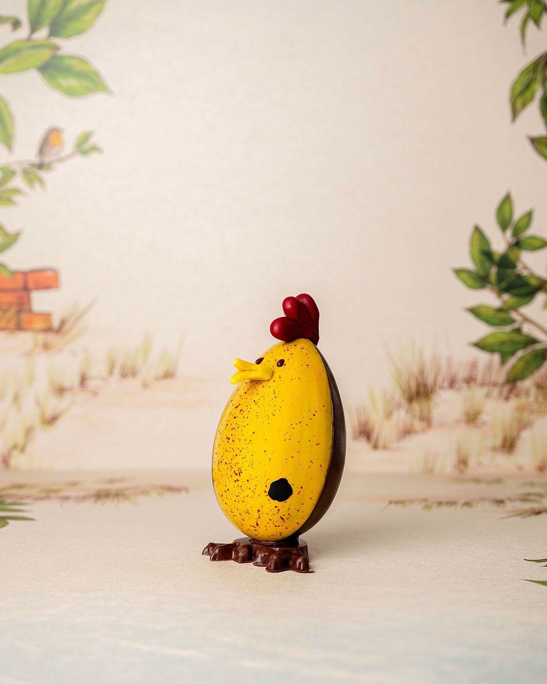 Œuf poule en chocolat au lait 48% végan garni de fritures sèches et pralinées végan*.