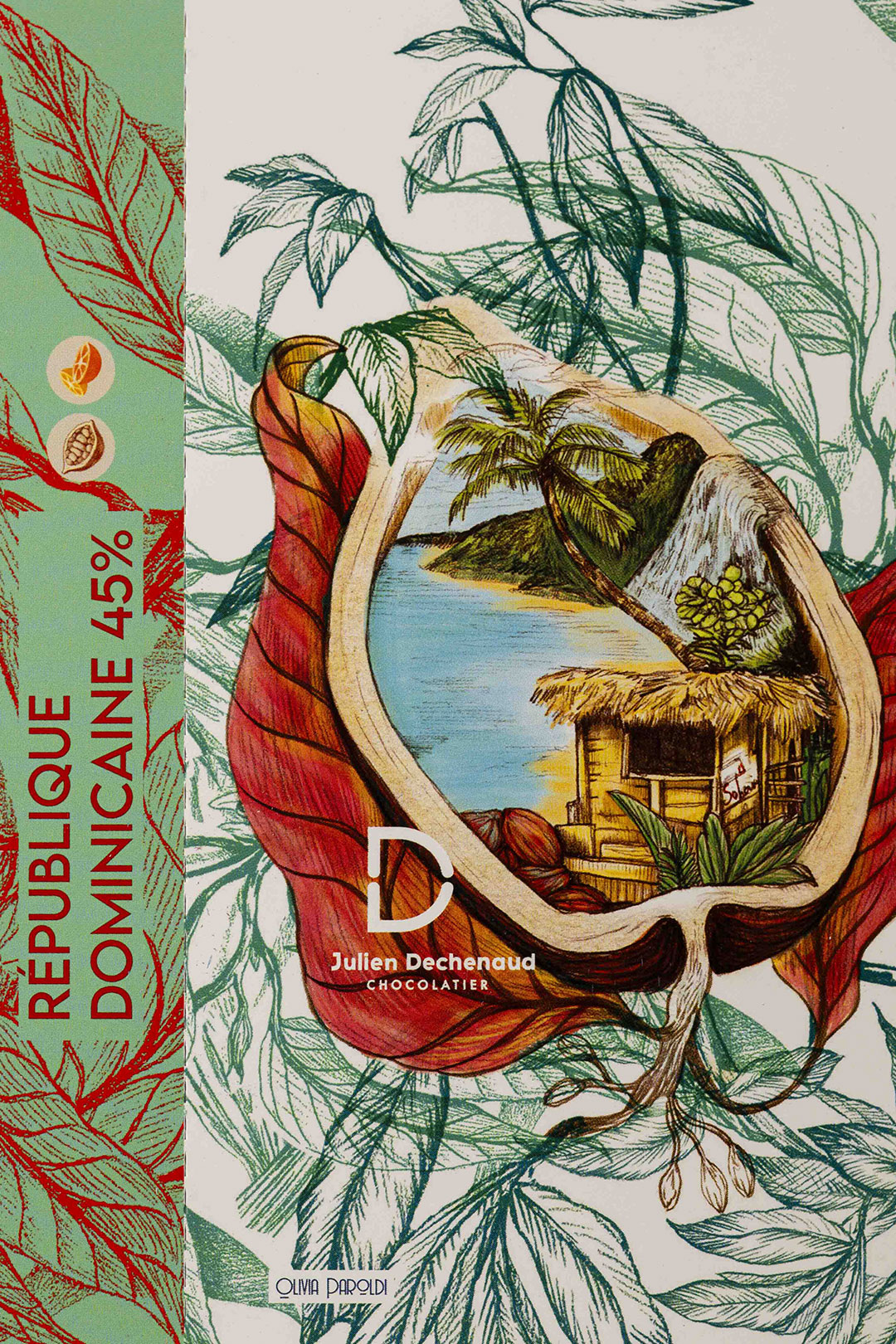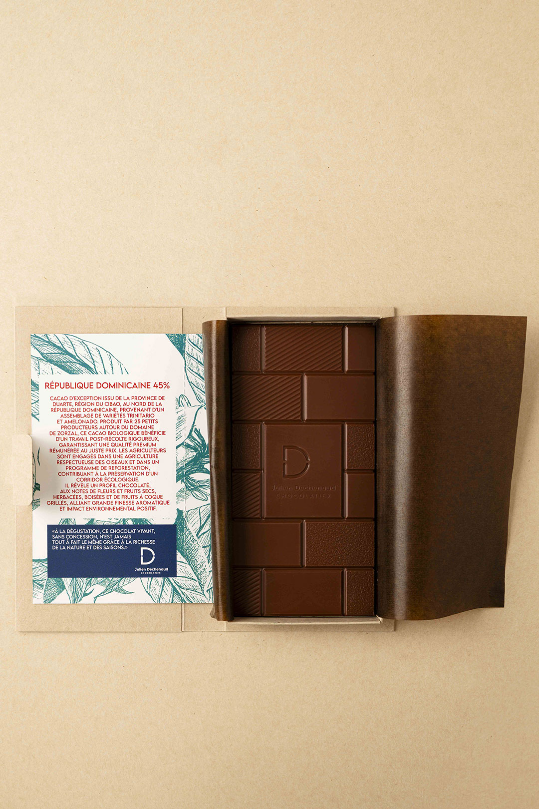 Chocolat au lait 45% République Dominicaine avec des notes lactées, cacaotées, thé noir, tabac et agrumes.