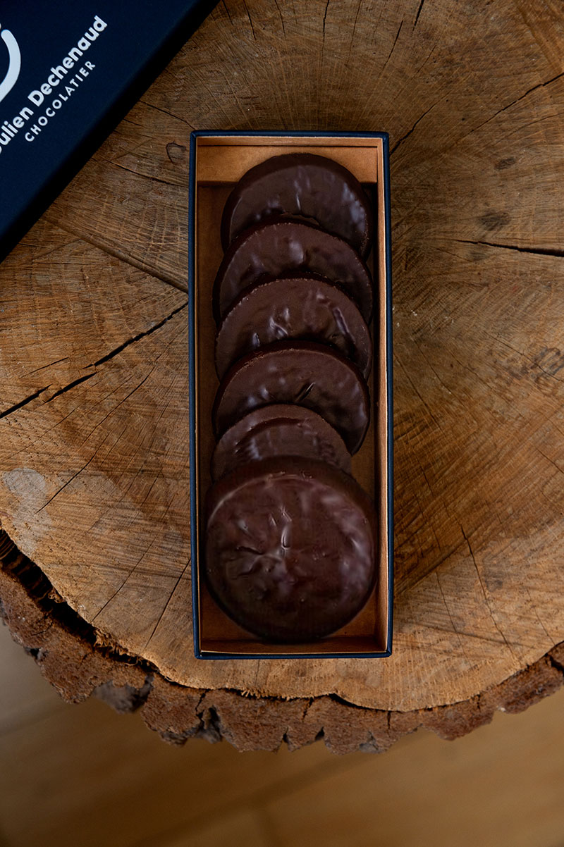 Boite de 6 orangettes : écorces d’orange confite de Calabre, chocolat Cameroun 70%.