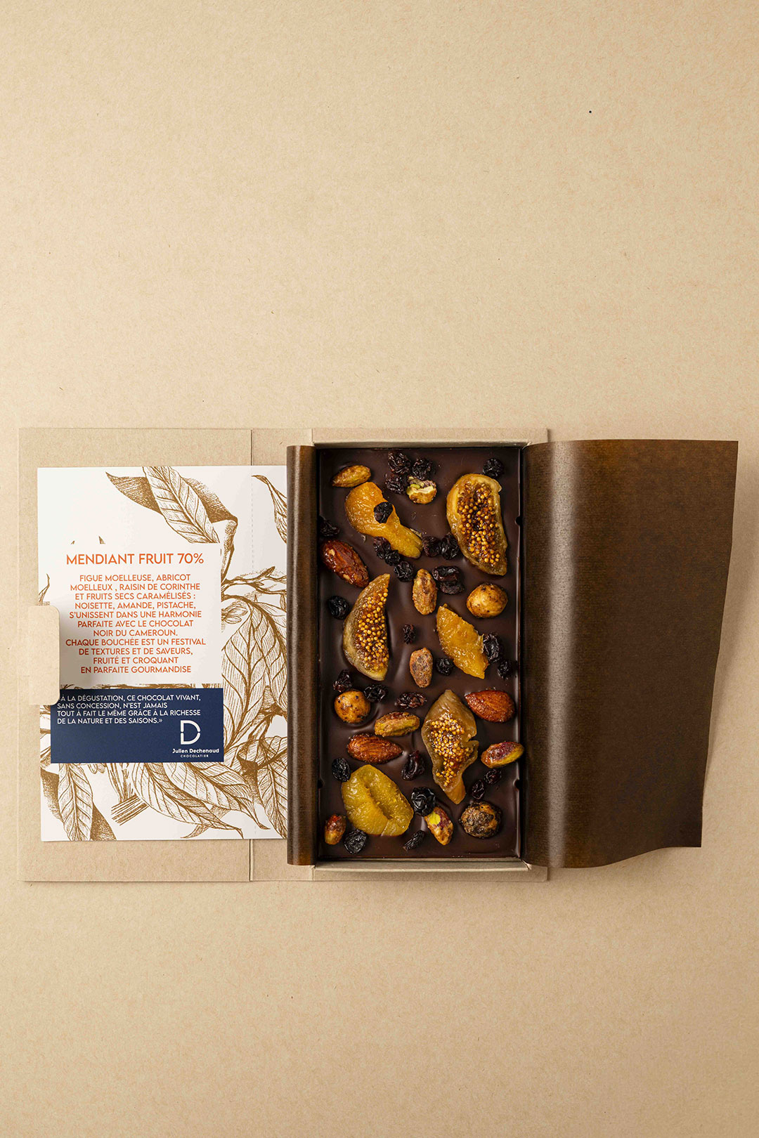 Chocolat noir 70% et fruits secs et confits.
